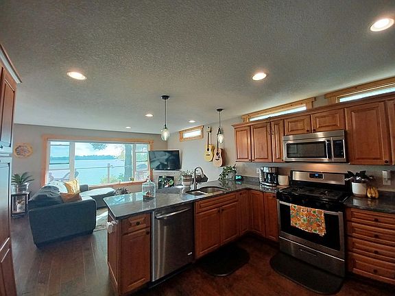 Views of the lake from every room in the house. Master is on main level with walk through full bathroom, living room, dining area, and kitchen. Walkout lower level has a family room with electric fireplace, laundry room, 2 bedrooms, and a newly remodeled bathroom with beautiful white subway tile in the shower.