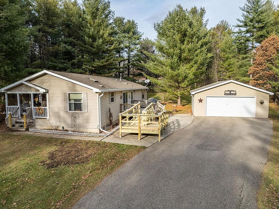 Not much to do here except sit back and relax. Easy to maintain home w/ everything on one level on a level lot. 2 car detached garage, 3 additional storage sheds. Deeded access to the Wisconsin River gives you more to enjoy a relaxing life. Primary bedroom w/ensuite bathroom with soaking tub & separate shower. 2 additional bedrooms give you space for family. Sip your morning coffee in the bright & open dining area or on your covered front porch. Mingle with guests in the cozy living room with the NEW tiled gas fireplace crackling in the background. Kitchen boasts w/recently tiled backsplash, room for an island, skylights & closet pantry. Enjoy wooded privacy and a paved driveway. Home sits on a concrete crawl space with gravel floor.