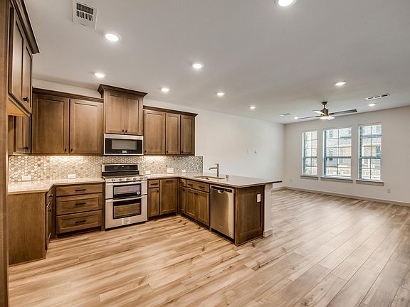 GREAT LOCATION & EXEMPLARY SCHOOLS, FABULOUS NEWER CONSTRUCTION LUXURY TOWNHOME design will IMPRESS you from the inside out, ideal for entertainment. Lots of natural SUNLIGHT located in huge greenbelt. Light colored interior w WOOD floors & gorgeous patterned carpet, MANY upgrades. 3 bedroom with small area upstairs. Kitchen features SS appliances, gas cooktop, spacious breakfast bar. Ecobee Smart Home System controls your thermostat, plays music & more with voice activation! Refrigerator included, washer & dryer. Designer throughout. Location of townhome is great with huge back greenbelt. Close to Grapevine shopping, minutes away from Lakeside Village & easy access to DFW airport. Community pool, playground, clubhouse & trails. Move in September 10, 2025.