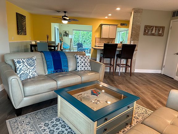 Walk to downtown Jensen Beach, quick drive or bike ride to the beach! Large lot on quiet dead end road steps from the best amenities Jensen Beach has to offer. 2/2 home with large one car garage and shed, comfortably furnished with all new appliances, large sunroom stepping out to your private patio. Kitchen is stocked along with essential bedroom linens, no need for anything but your own personal items. Master is complete with walk in closet and private bath with large walk-in shower. Off the kitchen is large laundry room and walk in pantry. Main entrance has covered patio, large driveway. Laminate floors, new stainless steel appliances, counter seating, ample storage, well stocked kitchen. Have a boat or RV? Storage space is available for rent.