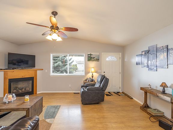 Well maintained three bedroom two bath home in the coveted Jasper Falls 55+ community(formerly Golden Splike). Walk through the front door to open living area and large kitchen with SS Appliances, breakfast bar plus laminate flooring throughout the house. Central Air plus a gas insert fireplace and ceiling fans. En Suite Master at the end of the hall can be your sanctuary for rest and relaxation. Guestroom is light and bright with sliding glass door to the back yard. Third bedroom could be used as a office or craft room. Laundry room w/storage/W/D with door to large 2 car garage. Upgrades include tankless water heater, maintenance free landscaping with rock/artificial turf, French door with built in blinds opens to the back porch/yard. Nice covered front porch and views of Rathdrum Mountain. Enjoy Jasper Falls vast amenities(see list). HOA fees includes water, sewer, garbage, land lease and community plowing. RV/boat storage available.