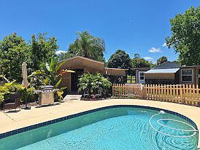 TROPICAL EQUESTRIAN PARADISE-1 OF A KIND! TURN-KEY = HORSES, AG EQUESTRIAN CERT. REHAB BOARDING, EQUINE ASSISTED THERAPY FACILITY ON QUIET CULDESAC. WELCOME TO A MINI HORSE FARM ON WELL MAINTAINED 1.43 ACRES IN EQUESTRIAN COMMUNITY! ROYAL PALM PINE NATURE PRESERVE RIDING TRAILS WALKING DISTANCE! SMALL UPDATED 2/2 HOME HAS ALL THE BIG $$ EXTRAS! NEW ROOF 2024, SPARKLING SALT GEN. DIAMOND BRITE POOL, 22KW 2024 STANDY GENERATOR W UNDERGROUND PROPANE 500TANK, TIKI POOL CABANA,ADT SEC., UPDATED WATER SYSTM & ELECTRIC, NEWER APPLIANCES. **EQUESTRIAN: 5 STALL BARN AUTO WATERS, FEED RM, TACK RM, SMALL RING W/GREAT FOOTING, PADDOCKS FENCED & CROSS FENCED, STAFF/VOLUNTEER LOUNGE, PARTICIPANT LOUNGE, TRAILER PARKING LOT, RV 30AMP AUTO COMMERCIAL GATE OPENER 2 LARGE GATES TO ACCOMODATE HORSE TRAILERS, HORSESHOE DRIVWAY WITH NEW MILLINGS.