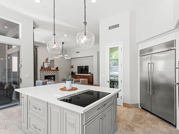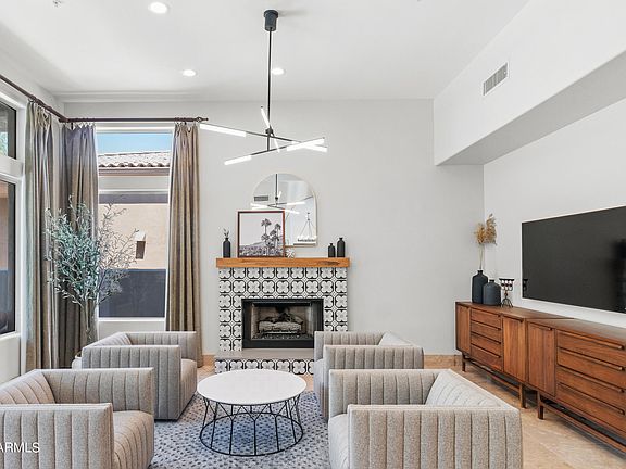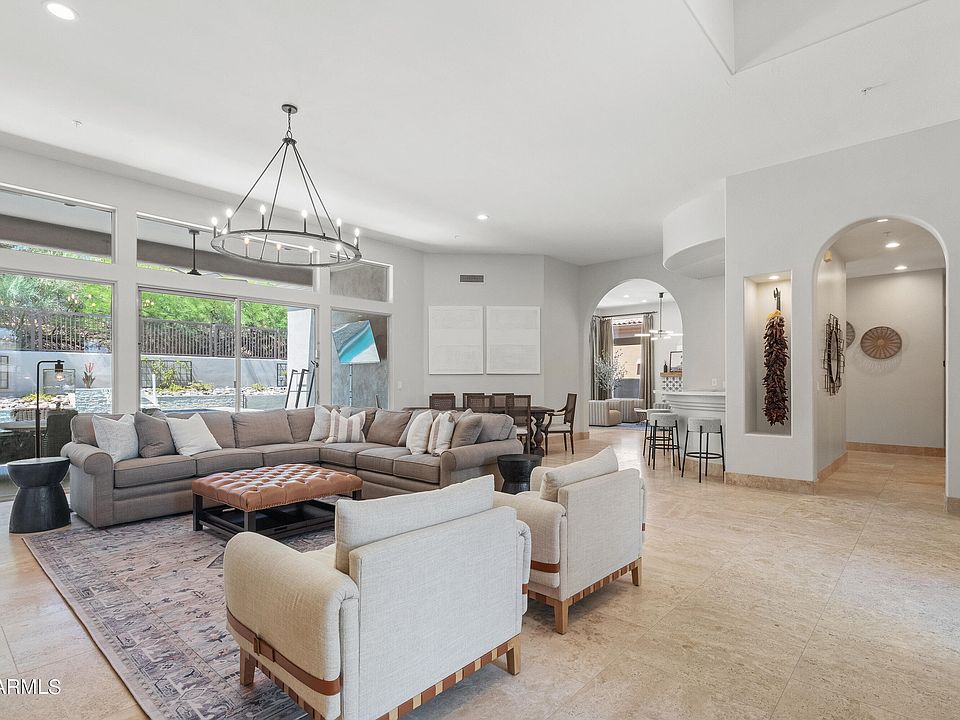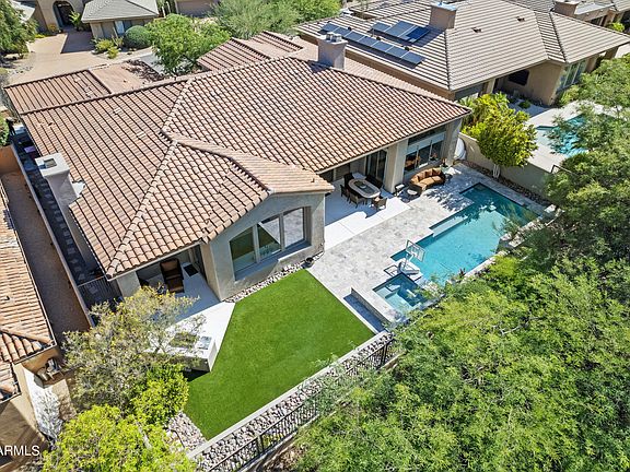 Scottsdale Mountain stunner back on the market and price reduced! This meticulously updated and maintained N/S facing cul-de-sac home features soaring ceilings and open concept living flooded with natural light. Fully remodeled chef's kitchen with giant quartz island, designer jack-n-jill bathroom, high end lighting, 3 updated fireplaces, new interior and exterior paint, and more. Step through the sliders to the outdoor oasis featuring a brand new heated pool, spa, and full yard makeover. 2 new Lennox air conditioners. Split floor plan with oversized primary suite with dual walk-in closets. Low maintenance, perfect family home or lock-and-leave in a 24hr guard gated community close to world class schools and Mayo clinic.