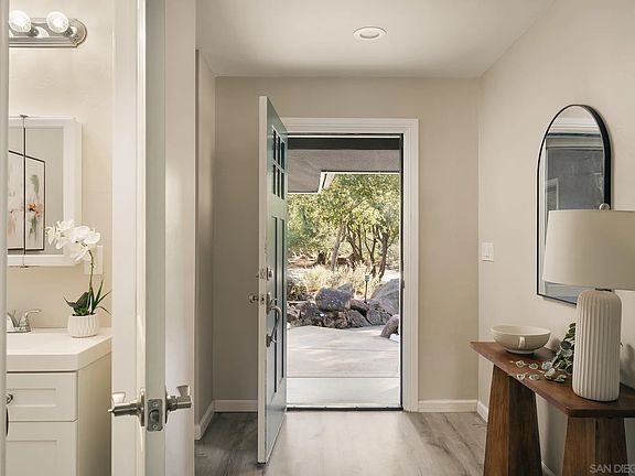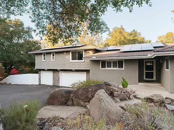 Discover a rare gem tucked away on a verdant cul-de-sac in the highly sought-after Green Valley neighborhood of Poway. Set on a serene 1.04-acre lot, this charming property blends tranquility, modern comfort, and timeless appeal. Step inside to find 2,741 square feet of elegantly designed living space, where sophistication meets everyday livability. The home features five spacious bedrooms and three and a half bathrooms, thoughtfully arranged for flexibility and function. The main level showcases an inviting open-concept kitchen and family room—perfect for both intimate gatherings and lively entertaining. Luxury vinyl and plush carpeting create warmth throughout, while professional-grade appliances elevate your culinary experience. Upstairs, two additional bedrooms share a stylish Jack & Jill bathroom, complemented by a versatile family room or guest retreat. An oversized three-car garage provides ample storage and includes a convenient laundry and craft room. Outdoors, embrace the natural beauty that defines this property. A spacious deck invites you to unwind beneath the canopy of majestic oak trees, with striking boulders and a seasonal creek completing the picturesque setting. Relax in the Jacuzzi overlooking the scenic backyard, or enjoy the covered sitting area beneath the deck, enhanced with modern lighting and ceiling fans. Meandering pathways loop through the landscape, perfect for peaceful strolls. Practical features include RV parking and an 8.5kW owned solar system with a 9.8 kWh battery, ensuring efficiency and sustainability. Ideally located near shopping, fine dining, parks, and walking trails, this home also belongs to the award-winning Poway Unified School District. This is more than just a home—it’s a sanctuary where nature, comfort, and convenience converge.
