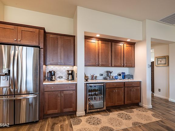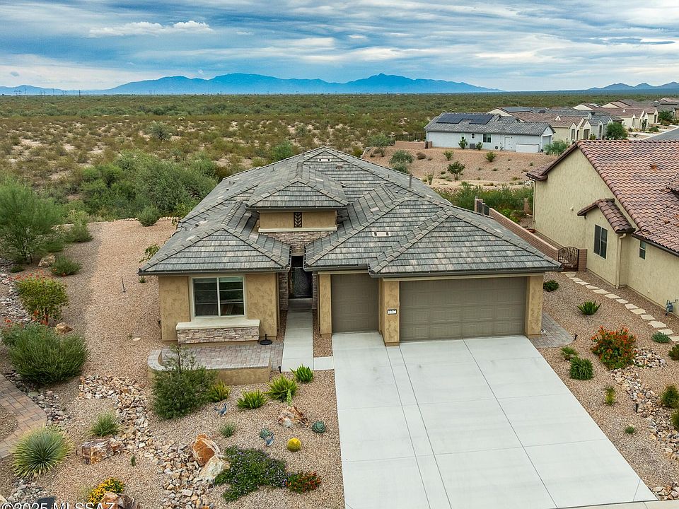 Infinite views over the desert to the Catalina & Rincon Mts. on this premium lot. A well appointed home with many upgrades! 4'extended owners suite, Quartz countertops throughout the home. High ceilings, walk in pantry, Built in Coffee Bar and Wine Cooler in the Fabulous great room. The dining room and great room both overlook the brick pavered patio with desert and Mt. views. The 3 car extended garage has storage, utility sink and a pedestrian outside door. Outside the landscape is low maintenance. Entertain guests on the covered patio with water feature that over looks the beautiful Sonoran desert with miles and miles of views.