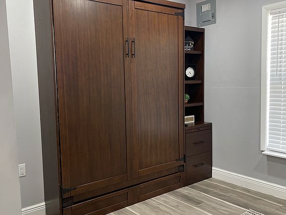 Spacious bedroom featuring a foldable Murphy bed for flexibility and extra space