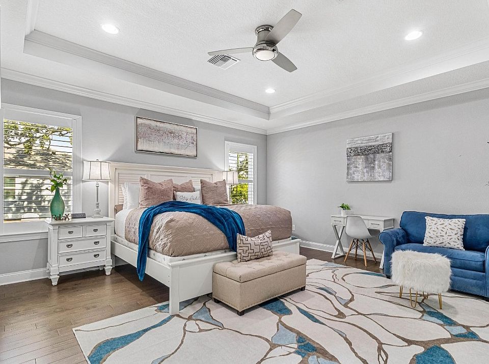 Upstairs, the extra large master bedroom has a king bed, an optional vanity/desk, a large walk in closet, and a large en suite bath.