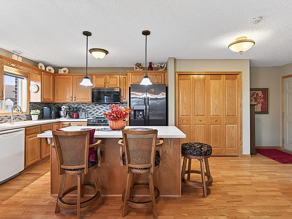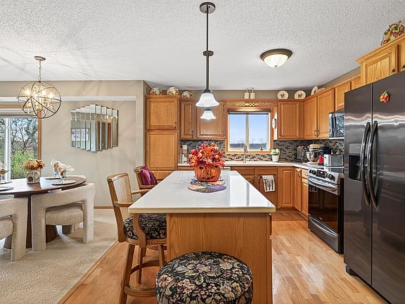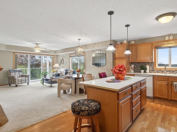 Rarely available end unit at Bard's Crossing I, a 55+ community. This condo is on the backside of the building, overlooking a park reserve. Single-level, open concept living in a meticulously well-kept building with elevator. No stairs required, inside or outside this building & condo. Situated on the top floor, you will have no one above you in this condo. When stepping into this home, you will immediately notice the view! This home is on the back corner of the building, overlooking the park reserve to the south. The kitchen is completely open and features a center island, plenty of cabinetry, solid surface counters and a kitchen window with a view of green space and trees. You will appreciate the large windows & patio door on 2 sides of the living / dining areas. The living room flows effortlessly onto the tree-top deck. The fireplace is free-standing and will be removed before closing. The primary bedroom is spacious and features a large, private 3/4 bath with step-in shower, large vanity and a linen cabinet tucked behind the door. Another wonderful feature of the primary bedroom is the spacious walk-in closet. The 2nd bedroom could also be used as an office or media room. Looking for storage options? This home has extra storage in the large, in-unit laundry room, a generous storage room at garage level and storage cabinets in the parking spot - One underground parking spot included. New roof 2024! Dues even include 200+ "cable" channels and wireless internet. Located near downtown Rosemount, trails, shopping and restaurants.