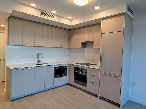 Sleek kitchenIntegrated appliancesStone countersFlat-panel cabinetryAir conditioningWide plank floorsGenerous storage