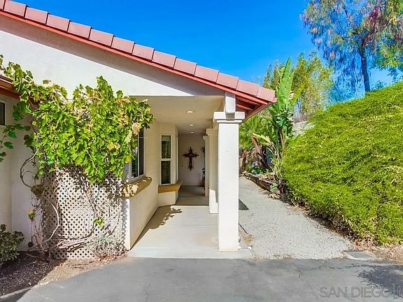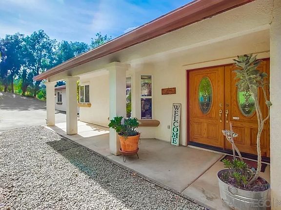 Spacious family home nestled at the end of a peaceful road on a half acre and designed with spectacular canyon views of Valley Center in mind. All of the rooms are private and have the benefit of a canyon or garden view. This distinctive Valley Center residence was built with care and attention to detail by builder/contractor Kelly Hedges. He applied an open design concept to give a spacious feeling and better function for living, dining and kitchen areas. Much planning and care were considered in the design. Upgraded 26 Solar panels with transferrable Power Purchase agreement. Move-in ready with new LVP flooring and main bedrooms have new carpet! Light-filled kitchen with granite counter tops, Blanco black granite composition double basin kitchen sink, stainless steel appliances and plenty of storage. Enjoy the outdoors dipping into you Aquastream Swim Spa and deck with pergola and waterproof planks. 5-person hot tub is located in a secluded garden area. Lush and low maintenance landscaping, covered patio area are to be enjoyed entertaining around your BBQ island with TV connection, sink and fridge. Chicken coop is currently being utilized and plenty of storage with two large sheds. Fruit trees planted include: Thai lime, mango, cherry, grapefruit, lemon, 2 peach, orange, dwarf pomegranate, and 2 walnut trees. Passion fruit vines grow on the pergola in the back. A grapevine grows in the front by the kitchen window. See supplement
