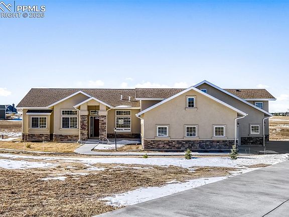 Welcome to this stunning Black Forest home located on 5 acres in a highly desirable subdivision two lots up from county-maintained walking/riding trails, plus easy access to additional trails throughout the area. 5-6 beds total/4 baths/6 car garage on five acres. Soaring 14-foot ceilings & expansive 10-foot ceilings throughout, creating an open/airy feel. The living room features a dramatic wall of windows, gorgeous lighting, + beautiful indoor/outdoor fireplace w/custom mantel—perfect for both everyday living and entertaining. The home offers a true cook’s kitchen w/massive granite island, along w//separate secondary prep/cook island area includes double sinks, separate ice maker, wine fridge, custom appliances, & stunning sinks & faucets. Adjacent to the kitchen is a formal dining area filled with natural light and accented by an eye-catching coffered ceiling. An additional room on the main level can serve as an office, bonus room, or extra bedroom & features beautiful tray ceiling and closet. The main level also includes a full bath with quartz countertops.2 bedrooms share a Jack-and-Jill bathroom w/views, double sinks, quartz countertops, & custom cabinetry. On opposite end of home, a luxurious primary suite offers privacy & comfort, featuring striking stone fireplace, spa-like bathroom w/ gorgeous walk-in shower w/ dual shower heads, a freestanding tub, custom leathered granite countertops, and a spacious walk-in closet. The primary suite connects conveniently to the laundry room, which includes a washer and dryer that remain with the home, along with leathered granite countertops. From there, enjoy easy access to the 40x48, insulated garage w/2 stubbed gas lines, fits 6 cars and/or Class C w/sewer dump just outside. Double staircases lead to an expansive basement with complete kitchen, 2 bedrooms & bath, massive great room along w/storage or 7th bed & 5th bath option. Basement has own entrance, perfect for multigenerational living. Unbelievable opportunity!