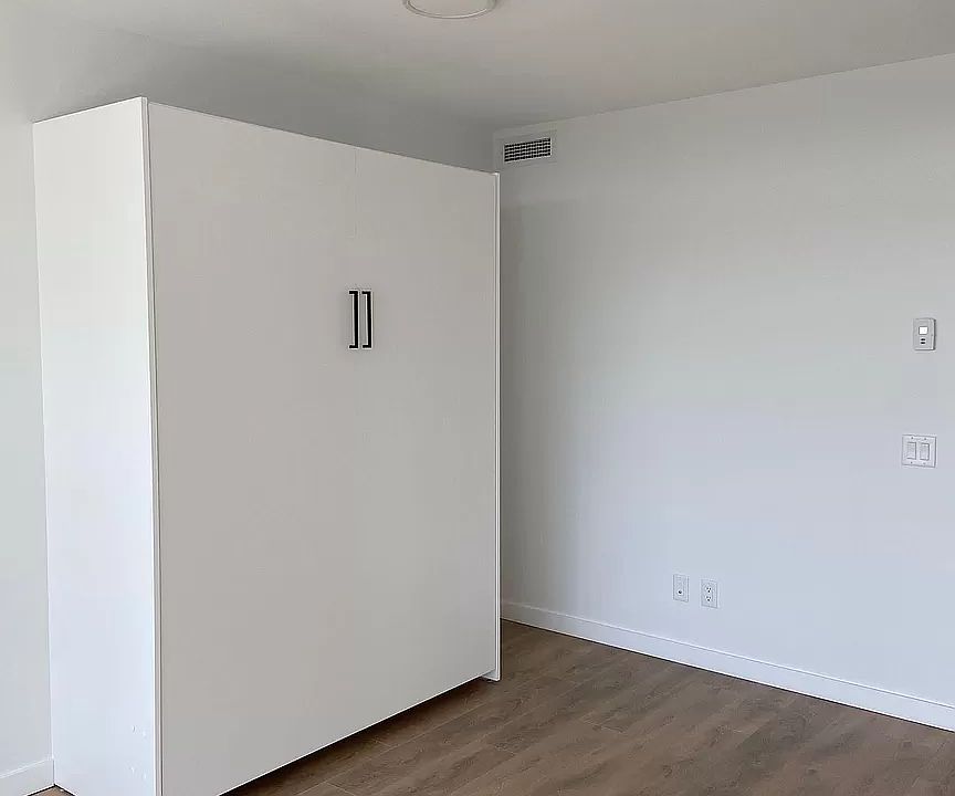 Murphy bed setupLaminate wood flooringBosch glass cooktopBosch ovenBlomberg dishwasherQuartz countertopRoller blinds