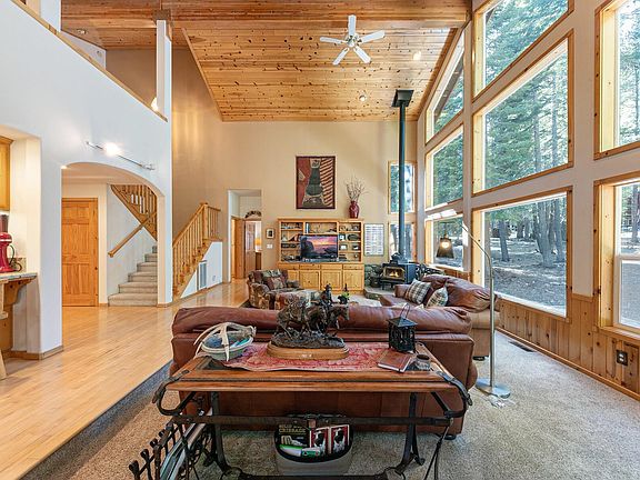 Located on a level and south facing lot in Tahoe Donner, this classic 3BD mountain home provides ample space as a retreat or primary residence. A large air-lock entry mudroom leads to a spacious kitchen and dining area with a cozy wood burning stove & vaulted wood ceilings. The primary suite is on the main level with access to rear deck and backyard. The two car garage leads to a laundry hall with plenty of storage and a door that closes off the main living area. Upstairs you will find an open loft with 2 bedrooms and full bath with ample space for friends and family. The large rear patio provides an open canvas for back yard BBQ's and entertaining on those long summer days.