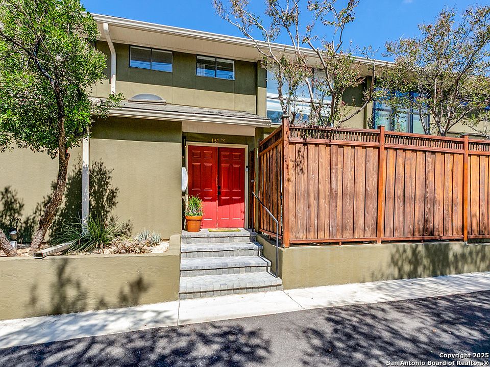 Enjoy restaurants, shopping, and Central Market at your doorstep! This stylish townhome features contemporary design elements in the "urban living" section of Alamo Heights. Designed with three levels, it's walkable, yet secluded. The residence boasts private interiors and outdoor patios, plus treetop views. Its clean lines and colorful decor create a chic backdrop for the bright, sunlit spaces. Enter on the main level (floor 2) into the living and dining rooms, separated by a wood-burning fireplace. The spacious kitchen's new countertops and custom cabinetry give an upscale vibe. Upstairs, the primary suite and guest bedrooms have lofted ceilings with oversized windows. A guest bath has a soaking tub + shower, while the larger primary bath offers a dual vanity and shower. On the basement level, a hidden bedroom suite with walk-out patio is the perfect spot to host guests. A large closet hides the in-unit washer & dryer (side-by-side), with extra storage spaces throughout. The attached one-car garage includes a JuiceBox 40amp e-charging station and storage closets. (Many residents park a second vehicle in front of their residences.) Live in your pajamas with no prying eyes-you'll love this hidden gem!