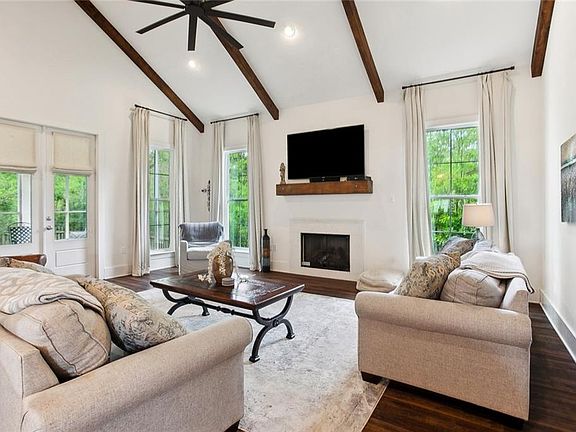 The primary suite offers a luxurious retreat, complete with a huge walk-in closet, a soaking tub, double vanity, and a spa-like walk-in shower. A second bedroom with a full attached bath is also located on the main floor — ideal for guests or a home office. The heart of the home features a large open-concept living room and kitchen, highlighted by exposed wood beams and a soaring cathedral ceiling, giving the space warmth and character.