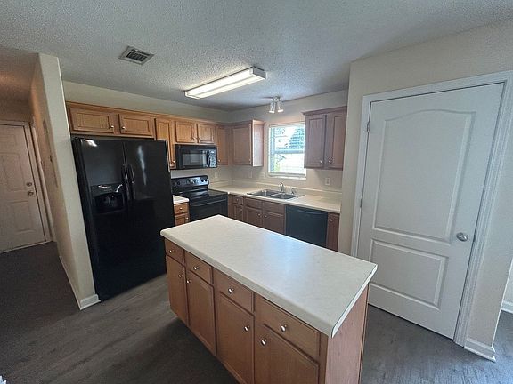 The house features spacious living room, large bedrooms, island-style kitchen, and a back patio. All major appliances are included: refrigerator, stove, dishwasher, microwave, and washer & dryer.