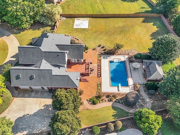 Nestled on over one acre in sought-after Turtle Creek, this gorgeous brick, custom build delivers striking appeal inside and out. Four bedrooms, 3.5 baths with just under 4,000 sq ft of living space, this home is ideal for families and also those who desire privacy for guests. Lush landscaping, a circular drive, sparkling saltwater pool, pool house w/kitchenette, A/C, full bath & outdoor bar. The expansive outdoor living spaces provide tranquility and idyllic entertaining. The impressive front porch and two-story foyer welcome you into the design of your dreams. Open and airy with tons of natural light, the flow and scale here will suit your every need. The formal dining and study flank the entry. The beautiful great room offers soaring ceilings, built-ins and gas fireplace with custom molding surround. The eat-in kitchen, renovated in 2019, features bar seating, abundant cabinets, quartz counter tops, pantry and built-in desk. The spacious sunroom is heated & cooled with panoramas of the private backyard. The main floor owner's suite offers a roomy spa bath, separate shower, jetted tub and two walk-in closets. Bedroom #2 w/ensuite, also situated on the main floor is tucked away near the rear stairway. The powder room and laundry w/sink complete the main floor. The upper-level layout is ideal with an open loft, two bedrooms, full bath, an enchanting media/theater room and two large walk-in attics for convenient storage. Additional improvements include hardwood flooring, central vac, upgraded lighting, side entry garage w/2 storage rooms, new pool liner 2025, privacy fenced backyard with lovely brick walkways and patio, and freshly stained deck. The neighborhood is serene and friendly with amenities including tennis courts, club house and pool. Highly rated schools and convenient to shopping, dining and golf. A short drive to vibrant Greenville, Spartanburg, and the picturesque North Carolina mountains.