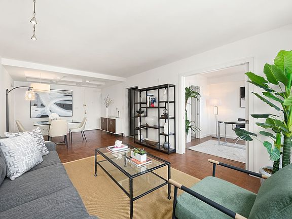 Located in a full-service building with a landscaped roof deck, fitness center, central laundry, live-in superintendent, and attended lobby. Pets, co-purchasing, and pied-à-terres are permitted with board approval.