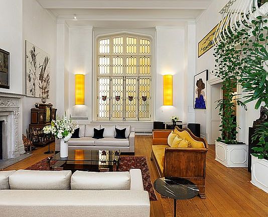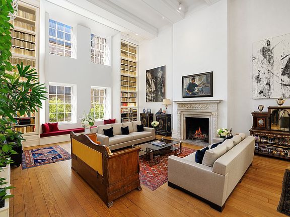 A gracious entrance gallery sets the tone, leading into the breathtaking double-height living room where four large south-facing windows flood the space with light. The scale and volume of this room are extraordinary - 19-foot ceilings, floor-to-ceiling bookshelves, a wood-burning fireplace, and an exquisite original 15'4" north facing stained-glass window.