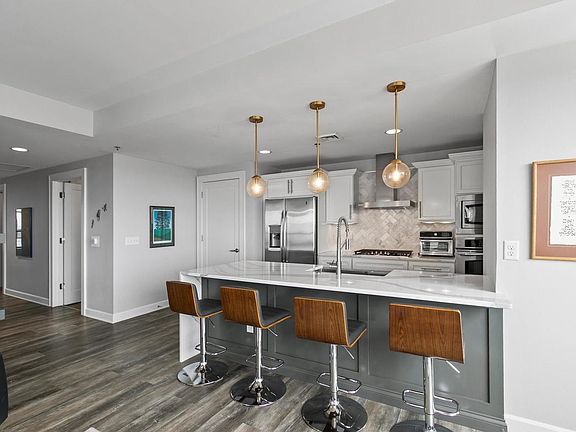 Desirable open floor plan at the luxury Marina Condominiums in downtown Madison! Oversized windows offering expansive city view w/partial views of Lake Mendota and Monona. Oversize balcony with gas convenience port, spacious living/dining/kitchen area, gas fireplace, many built-ins! Walk in closet(s). Many updates include Cambria quartz counter tops, Solera farm sink, tiled backsplash, LVP flooring. Murphy bed in 2nd bedroom with en-suite full bath. In unit storage. 2 parking spaces #1 and #96.