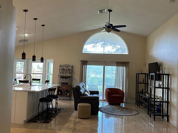 Price Reduced to Sell! Beautifully updated 3-bedroom, 2-bath split-bedroom home with 2 car garage, featuring an open floor plan with high vaulted ceilings. Located in a desirable small, quiet, gated community.Home offers full hurricane protection with impact glass windows and doors. The kitchen includes a large island, farmhouse sink, marble countertops, and stainless steel appliances, including a gas stove! Home also has a gas water heater.Continuous Travertine flooring extends throughout the home. Enjoy outdoor living with a screened-in patio and fenced backyard--perfect for relaxing, entertaining, or playtime with children or pets.