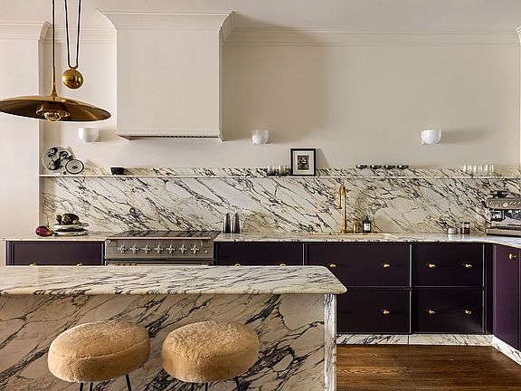 The kitchen unfolds from the living area with quiet sophistication, with custom cabinetry and tactile stonework. Arabescato Fiorito Viola marble wraps the counters, island, trim, and baseboards, paired with integrated Fisher & Paykel refrigeration, a 36-inch AGA Elise induction range with custom vented hood, and an 18-inch wine refrigerator. Forbes & Lomax solid brass control fittings and a discreet walk-in pantry with a ventless LG washer-dryer add functional refinement.