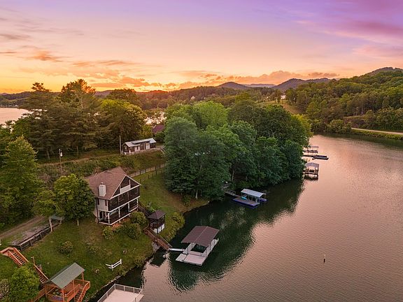 Built by a Builder for His Family...Lakeside Living in the North Carolina Mountains! Located on the banks of Lake Chatuge, this 3 bedroom, 2 full bathrooms & 2 half baths home offers, an open floor plan with a great room with cathedral ceiling & exposed beams, wood burning fireplace & built-in bookshelves, a beautiful blend of drywall and wood interior, a kitchen with granite counters and stainless appliances including a gas cooktop, wall oven, pantry, a large screened-in deck with Tigerwood decking overlooking the lake with and outdoor gas log fireplace & the master bedroom & laundry on the main level. Master bathroom features a glass & tile walk-in shower. The upper level features 2 guest bedrooms, a bathroom, & an outdoor sleeping porch with 2 hanging swing beds. The lower level features a living room, a half bath, a bonus room, and another deck overlooking Lake Chatuge. PLUS there is a storage building, a fenced-in side yard for your furry family members, a lakeside pavilion, and a covered single slip dock with swim platform & jet ski.