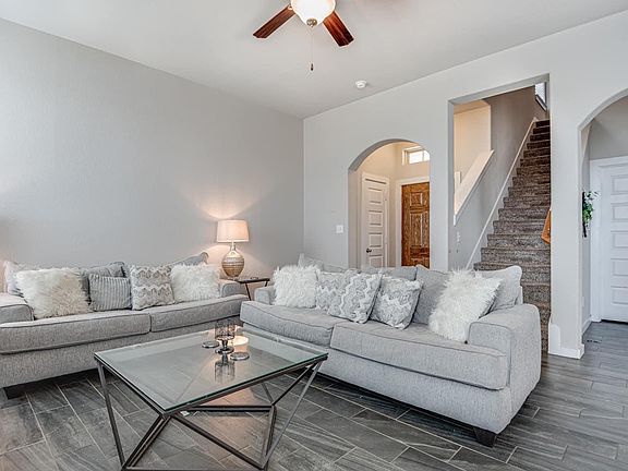 Modern tileOpen floor planHigh ceilingsBack patiosFenced in yardsBreakfast bar