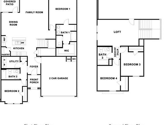 The first floor includes 2 bedrooms and 2 bathrooms. The primary bedroom is at the back of the home, off the family room, and includes an attached bathroom. This relaxing bathroom space features a 5’ walk in shower, double sink vanity, private toilet area with a door, and a walk-in closet. At the front of the home is a secondary bedroom, bathroom, and utility room. The secondary bathrooms include a tub/shower combination.