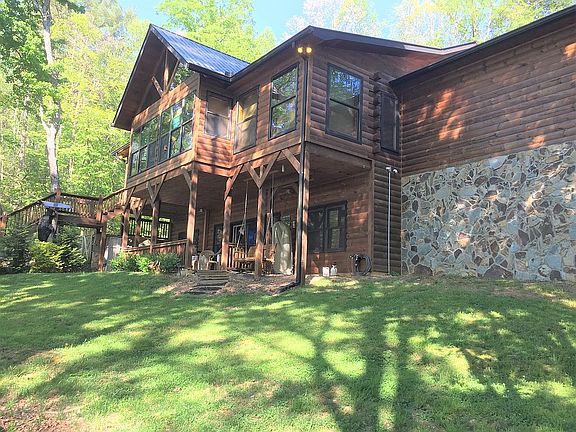 Custom log cabin Sitting pretty on a 19 +/- acre pristine lake w/year round mountain views. Almost an acre w/ 200 ft. on the lake. Living area boast an open floor plan leading to a lg. sunroom overlooking the lake. Cabin has 4 BR.2 1/2BA. all w/ vessel sinks. 2 bedrooms up and 2 bedrooms downstairs w/ a walk-out covered patio. Unique kitchen w/ custom cherry cabinets & countertop to simulate wood. 2 out buildings one on the lake 10 x 20 and another 10 x 12. A hot tub is inside off the sunroom at one end & a screened-in porch on the other end encompassing over 46 ft. The lot is well kept w/a fenced-in area. Exterior of the cabin has been re stained and painted. A dock is on the lake for fishing, relaxing and enjoying the view. Downstairs features a great room W/ built in coffee bar w/ sink. Attached 3 car garage w/ room leftover w/ a workbench and storage. Whole house generator is included.