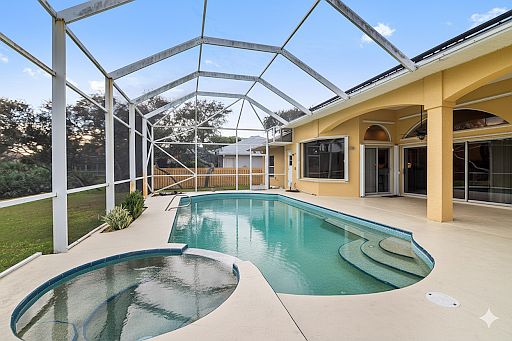 spacious screened pool area and green space from most rooms. Prime location in the neighborhood with huge backyard that only has 1 adjoining neighbor! 3 bedrooms and 2 double sink bath + laundry room with long countertop, CLEAN 2 car garage. Primary Bath has separate ''throne room''. Hurricane shutters included! Martesia offers sidewalks, walking trails, tennis / pickleball courts, and more. Easy to get approval of this lightly involved HOA. Friendly neighbors & even 2 entrances to neighborhood. Beachside location can't be beat! WALK or short drive to shopping, groceries and lots of local restaurants, too. Beach Access via Bicentennial Park just across A1A!