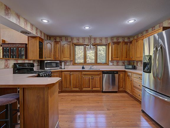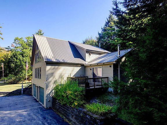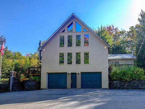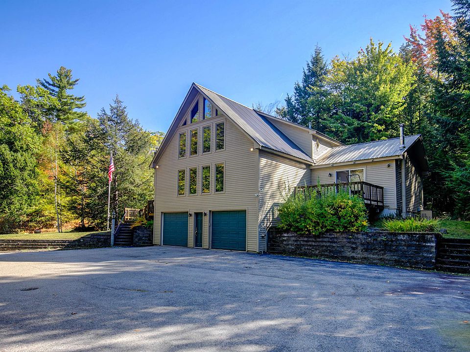 Welcome to the White Mountains! This charming contemporary 3-bedroom, 3-bath home features a 2-car garage plus a 1-car detached garage with a spacious workshop, sitting on 1.68 acres and perfectly blending comfort with mountain living. The main level welcomes you with a stunning cathedral-ceiling living and dining area, where floor-to-ceiling windows fill the space with natural light and a pellet stove adds warmth and ambiance. A sliding door opens to an expansive deck, ideal for outdoor entertaining or quiet mornings with a cup of coffee. The well-appointed kitchen boasts stainless steel appliances, abundant cabinetry, and generous counter space, complemented by a convenient laundry area, half bath, and a bright glass-enclosed porch. The spacious primary suite offers dual closets and a spa-like bath with an oversized jacuzzi tub beneath double skylights and a separate shower, along with a private slider to its own sun-filled deck. Upstairs, two additional bedrooms share a full bath, while the lower level provides a versatile bonus room and a cozy man cave with a pellet stove, along with direct access to the 2-car drive-under garage. Perfectly located in Mount Washington Valley, this home offers easy access to incredible ski areas, endless hiking trails, kayaking on the Saco River, and a host of outdoor adventures. This property is a true four-season retreat that captures the quintessential White Mountains lifestyle.