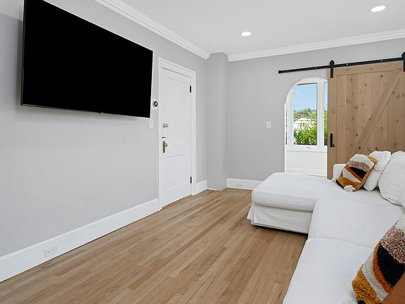 Modern fixturesHigh ceilingsRecessed lightingElegant curved archwaysMature privacy treesCenter islandDesigner backsplash