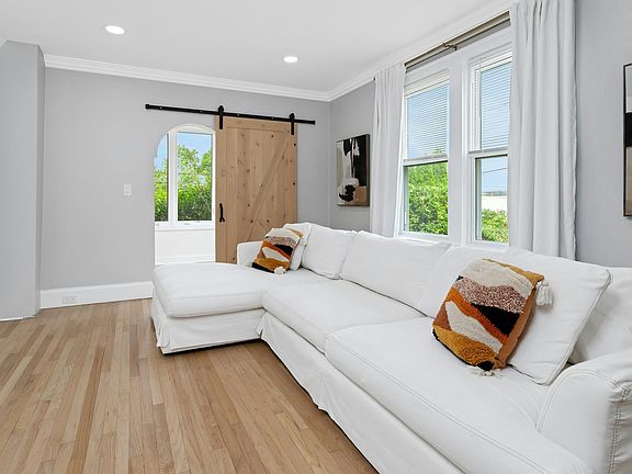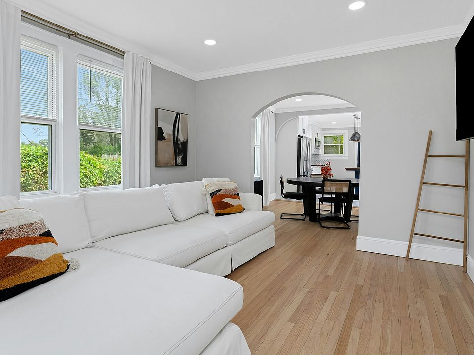 This beautifully updated 2-bedroom, 1-bath apartment blends charm with modern finishes. Featuring hardwood floors, high ceilings, recessed lighting, and elegant curved archways, the layout offers both character and functionality. The spacious living room opens to a sunroom with oversized windows, ideal for lounging, working, or as an artist's retreat. A dedicated dining area flows into the renovated kitchen with stainless steel appliances, farmhouse sink, center island, and designer backsplash. The primary bedroom is generously sized with ample natural light and a bold accent wall, while the second bedroom includes built-in shelving for storage or display. The refreshed bathroom boasts dual vanities, modern fixtures, and a jetted tub for added relaxation. Enjoy access to a shared yard framed by mature privacy trees, creating a peaceful outdoor space. Walking distance to the Glenbrook Train Station and just minutes to Downtown Stamford's dining, shopping, and entertainment.