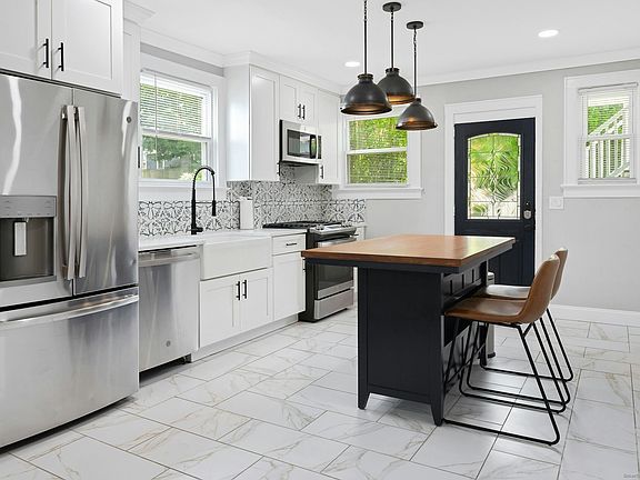 This thoughtfully updated 2-bedroom, 1-bath apartment blends classic charm with tasteful modern upgrades. Hardwood floors, high ceilings, recessed lighting, and graceful curved archways create a warm, inviting atmosphere throughout. The spacious living room extends into a light-filled sunroom with oversized windows - perfect for relaxing, working from home, or creating an inspiring studio space. A dedicated dining area transitions seamlessly into the renovated kitchen, appointed with stainless steel appliances, a farmhouse sink, center island, and a designer tile backsplash. The generously sized primary bedroom features abundant natural light and a striking accent wall, while the second bedroom offers built-in shelving ideal for storage or display. The refreshed bathroom includes dual vanities, sleek fixtures, and a jetted tub for a spa-like experience. Outside, enjoy a shared yard surrounded by mature privacy trees, offering a peaceful place to unwind. Conveniently located within walking distance to the Glenbrook Train Station and just minutes from Downtown Stamford's vibrant dining, shopping, and entertainment options.