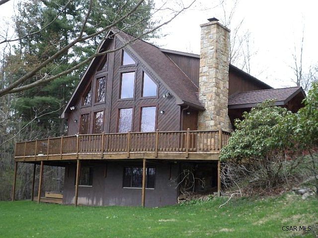 Privately located A-Frame style home sitting on 19.7 acres of land in the Westmont School District! Open floor plan with updated oak kitchen, sliding doors to wrap-a-round deck. 2-story great room w/ stone fireplace and cathedral ceilings. 2nd floor master suite w/ master bath w/ jetted tub, dual sinks, skylights & walk-in-closet. Finished lower level w/ wet bar & ceramic tile floors. Full walk-out. 7-stall horse barn w/ tack room & a 4-6 car garage/outbuilding included! Call now, this is a must see property! Ask about a one year home warranty.