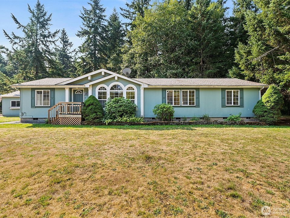 Lovely, private home on 5 acres! If you are looking for a peaceful setting, with flat land, this home is for you. Well maintained 1782 sqft home, with 3 bedrooms and 2 baths, and an open floor plan. The outdoor space offers a large, covered back deck, expansive yard, detached garage, large shop/barn, all surrounded by trees. Kitchen is light and bright, with newer stove top. Good amount of storage both inside and out. Minutes from I-5, and a quick trip into town for groceries and shopping.