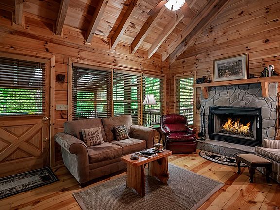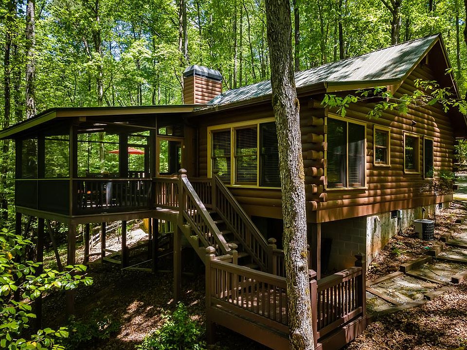 Situated on a quiet private lot, surrounded by native Mountain Laurel; this cozy fully furnished 2BR/2BA Log Cabin is charming to the core. The lot borders a 5' easement for the Benton McKay hiking trail which borders one of the beautiful private lakes of Cherry Log Mountain. There is additional access to 2 other lakes within walking distance right around the corner from the Cabin. The cabin interior includes a Kitchen/Dining combo with well-crafted pine cabinets and an extended dining area surrounded by windows; bringing the beauty of the lots lush green outside inside including a few glimpses of the lake below. The Great room's cathedral ceiling and flagstone wood-burning fireplace are at the center of the cabin with a cute sleeping loft w/ladder access overlooking from above. The master bath offers a big jetted tub & picture window for soaking your troubles away...Outside, the spacious screened porch with skylights flows right off the Great room; then out to the open deck area for enjoying the sunny days, and then into the stoned courtyard for many outside activities complete with a swing, metal firepit, grill, a great area for corn hole, all surrounded by a nice wooden fence so the pups can play too. A bundle of mountain treasures can be found here. Come and see for yourself!