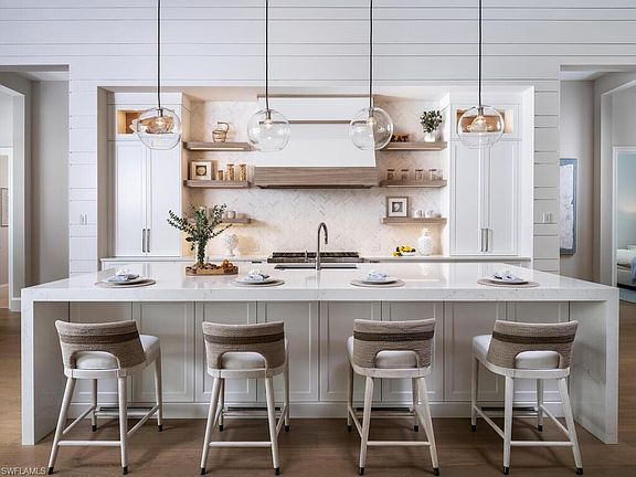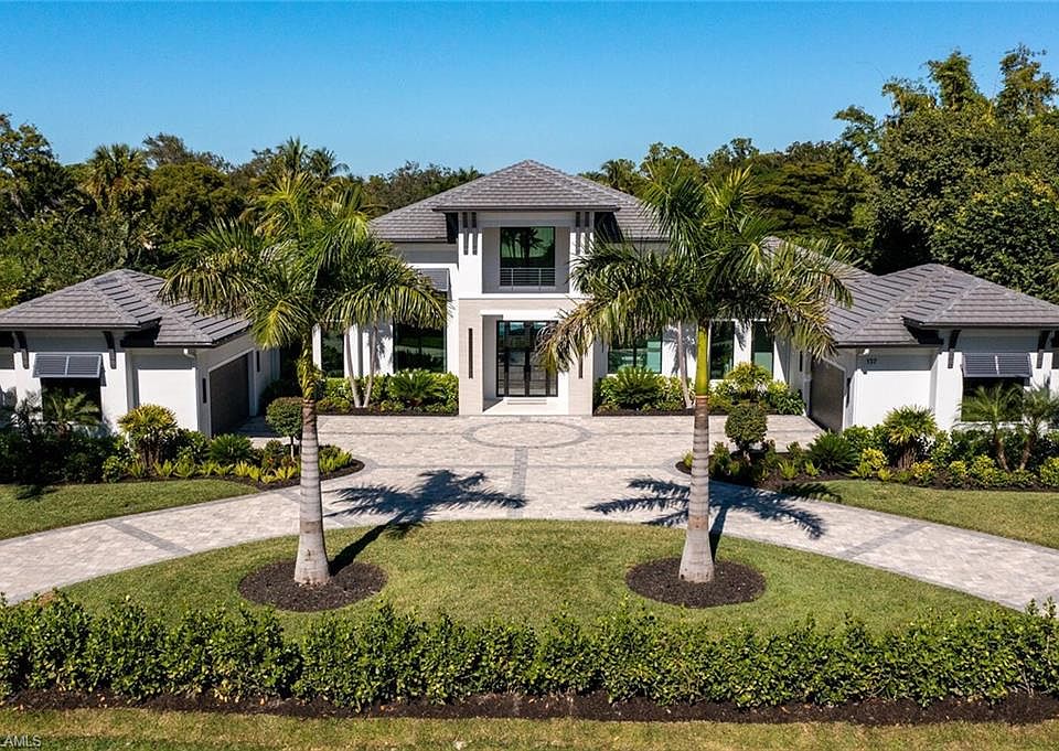 2024 Sand Dollar Winning Custom Home built by Platinum Custom Homes and furnished by Clive Daniel Homes, nestled on an idyllic 1 acre lot only minutes from the beach, this 4BR/5.5BA, 5,824 sqft executive residence emanates coastal elegance and immaculate tropical landscaping. Thoughtfully designed with both beauty and function, the sundrenched interior mesmerizes with soaring vaulted ceilings, an oversized great room with fireplace, and a gourmet kitchen featuring premium stainless-steel appliances, quartz countertops, gas range and a butlers pantry. Evoking luxe indoor/outdoor vibes, the entertainment-ready backyard includes a covered lanai, an outdoor kitchen, a fireplace, a swimming pool, and a spa. Blissful evenings are discovered in the primary suite which has huge dual closets and an opulent en suite with dual vanities, a soaking tub, a walkthrough shower. Three additional bedrooms have walkin closets and en suites. Other features include: 4-car garage, bonus room, exercise room, Collier County water, lighting control in main areas, Sonos speakers, generator, roll down screens & shutters, water softener, airconditioned garages, entry columns and gates are underway and so much more.