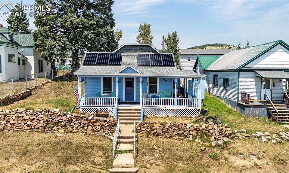 Welcome to your very own slice of Cripple Creek charm! This well-maintained 2-bedroom, 1-bathroom ranch-style home is the perfect mountain retreat or full-time residence. Nestled on a spacious lot, you’ll love relaxing on the wrap-around porch while enjoying visits from the town’s famous donkey herd and curious deer that wander by. Inside, you'll find a cozy living space warmed by a pellet stove, a functional kitchen with a generous pantry, and new windows that let the Colorado sunshine pour in. The home also boasts solar power for energy efficiency and a spacious backyard ready for your garden, fire pit, or furry friends. Whether you're looking for a weekend getaway, rental opportunity, or forever home, this little charmer is it.