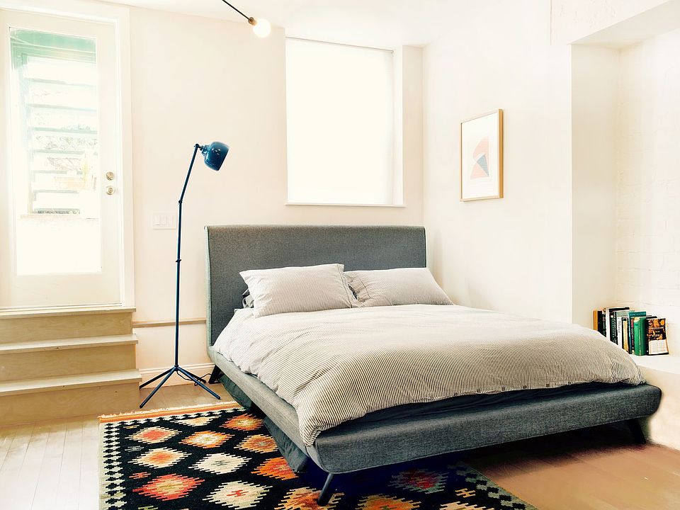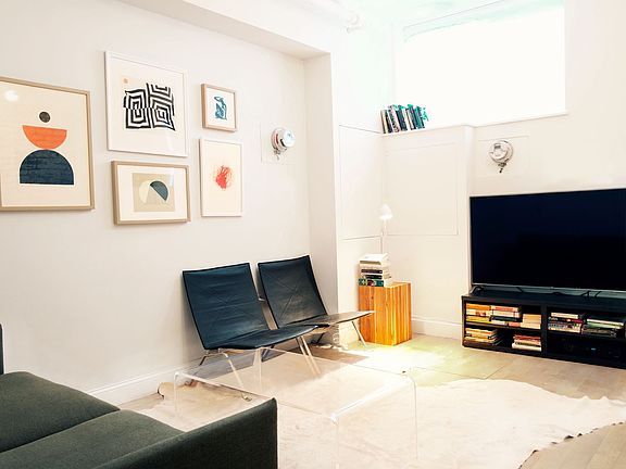 Open, clean designer garden level studio, with custom designer lighting fixtures, and access to outdoor lounge area. Full height ceilings with large windows and glass doors. Full kitchen with tons of storage. Separate living room area. Tons and tons of natural light flood this apartment. The apartment is in a Townhouse with one other rental above.