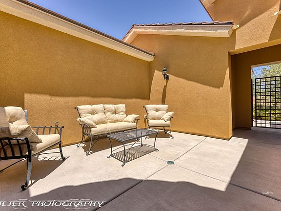STOP! Don't miss this lovely Sun City Iris home. The home sits on an elevated lot with stunning views of the Virgin Mountains and Flat Top Mesa. With mature landscaping & a large covered patio, this home was designed for warm family time as well as great entertaining. Enter the home through a charming gated courtyard. Inside is an open floor plan with vaulted ceilings. Gorgeous upgraded tile and carpet as well as custom window coverings accent the house. The large windows provide lots of light and create a wonderful indoor/outdoor living experience. The open den makes it easy to create a game area or an office. The kitchen is beautifully done with dark custom cabinets, granite countertops, stainless appliances and a handy slider to the front courtyard. The main bedroom with walk-in closet and bath are on the opposite end of the home from the guest room and second bath. Don't miss the oversized garage with epoxy flooring, plus overhead storage. Conestoga Golf privileges & resort style living available with this 55+ community. All SIDS are paid.
