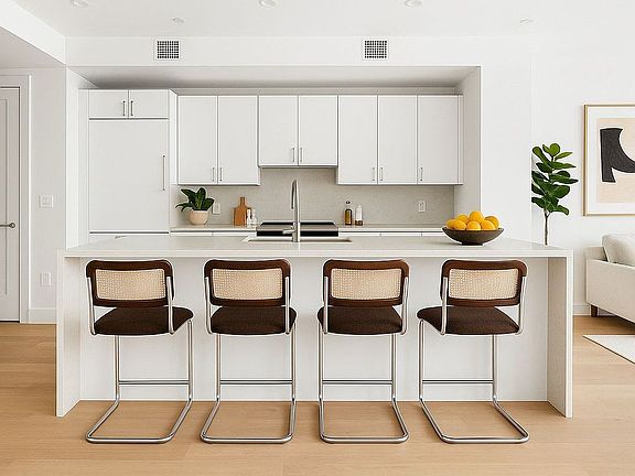 Upon entry, experience the best in open-concept living with a great room that provides plenty of space to comfortably stage a living area. This perfect haven for everyday living and entertaining also features a dedicated and distinct area for formal dining. The open-style chef’s kitchen is appointed with sleek white cabinetry, quartz countertops and backsplashes, a Grohe faucet, an Elkay kitchen sink, a Miele hood, and a top-of-the-line Miele appliance package, including an oversized refrigerator with a double drawer freezer, an electric cooktop, a wall oven, and a dishwasher. The well-proportioned primary bedroom accommodates a king-size bed and more, and includes a generously sized built-in closet for ample storage. The spa-like en-suite marble bathroom is outfitted with double sinks and vanities, Brizio fixtures, and a large shower stall. The secondary bedroom includes a well-sized closet and maintains excellent natural light. It is located near a spacious, windowed marble bathroom with intricately woven marble tile floors, double sinks with Duravit vanities, a deep Kohler soaking tub with Brizio tub and shower controls, and a Toto toilet. A stackable washer and dryer are located in the basement, completing the functional layout of this home.