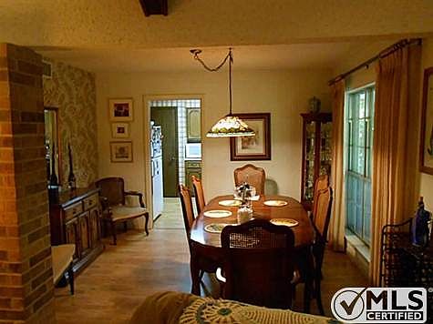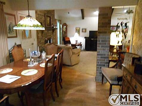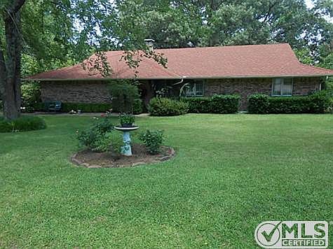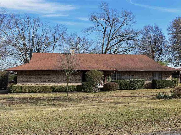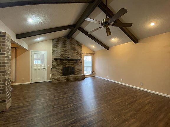 Spacious living area with beamed ceilings and focal fireplace. Living open to dining room and brick columns. Three nice sized bedrooms. Front bedroom has been used as an office but still has closet. Stand alone shower in main bedroom. Larger back yard with enough space for extra RV or boat parking. Enclosed patio and storage building!