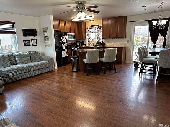 This home is beautifully maintained home in Gardnerville Ranchos. Landscaped in the front and backyard, with views galore! Mature shade and blossom trees in the front and back. Spacious backyard for all the activities! Primary bedroom has walk in closet and bonus closet for extra storage. Extended garage allows for projects, work space, and man door which leads out to the backyard. This home is a must see!
