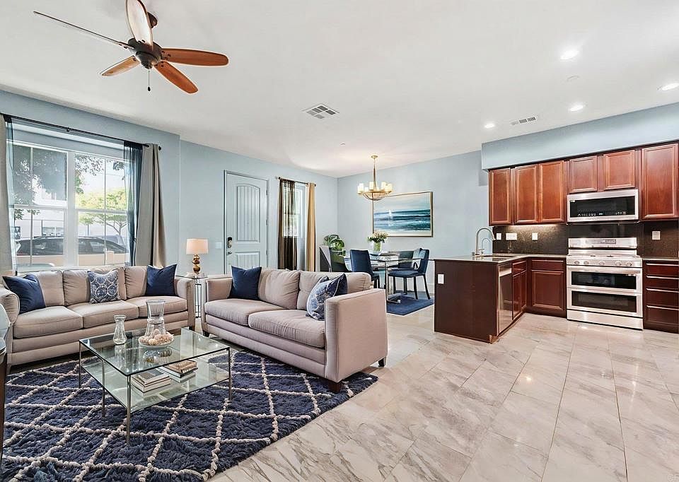 Located in the sought-after community of Montecito in Otay Ranch, this stunning 4-bedroom + loft, 3.5-bathroom property offers style and functionality. Equipped with solar, a reverse osmosis and water softener system, and many upgrades, this home is move-in ready. Welcome yourself into the open-concept main floor where the living room flows seamlessly into the kitchen. The kitchen features cherry oak cabinets, granite countertops, newer stainless steel appliances, a large walk-in pantry, and access to the 2-car garage with epoxy flooring. A half bath is located on the first floor, ideal for guests. Upstairs, the primary suite boasts a massive walk-in closet, a highly upgraded en-suite bathroom with enhanced shower and tub for extra comfort. Additionally you’ll find two additional bedrooms, a shared bathroom, and a laundry room for efficiency. The third floor features a spacious loft, a fourth bedroom and a full bath—perfect for a guest space, office, or rent out for additional income. Other upgrades include bathrooms with cherry oak cabinets, custom countertops, upgraded showers, and oversized bathtubs, tile and laminate wood flooring, ceiling fans in every room, A/C, and cherry oak-stained staircase railings with iron rods. Enjoy the outdoors in your private patio space. Montecito’s resort-style amenities includes pools, spas, a fitness center, sports courts, and a clubhouse. Conveniently located across from an elementary school and park.