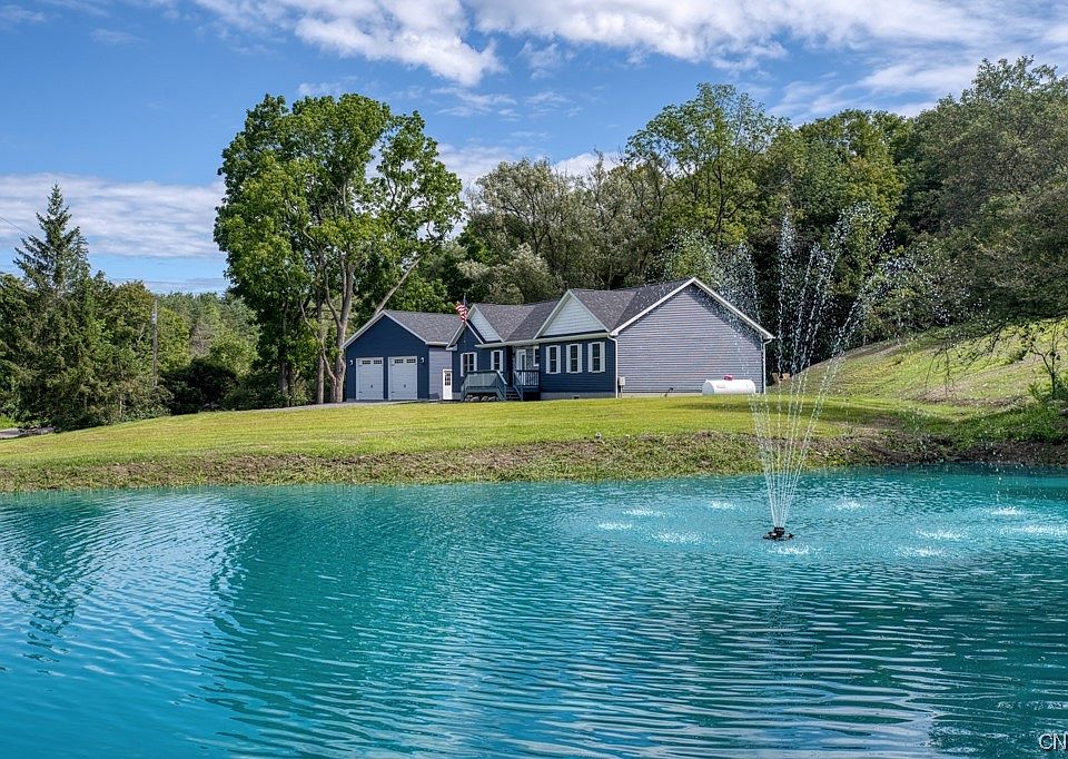 Seller is relocating & a lucky new owner will be able to call this tranquil escape HOME! Just over a year young & perched upon 12.78 picturesque acres including 2 trout streams, plenty of wildlife, gorgeous views + recreational opportunities all around. A hunters dream yet 5 minutes from Rt 81 & 20 minutes to Syracuse! Additional (~24+) acres potentially available. Built on 9' Superior Walls - offering 2100 SF on the main floor + 2100 SF basement w/tall ceilings for extra space to grow into or use as you wish. There is a 30'x30' detached garage w/12' ceilings & two 10' overhead doors in the front and a 9'x7' door in the back--easy access for all your toys. Kick your shoes off in the mudroom and you'll walk into an open-concept main floor layout w/an absolute DREAM kitchen. Plenty of room, HUGE sitting island, top of the line appliances, buffet area w/wine chiller, statement piece range hood & much more. The living area is open & offers detail work in the ceiling & a beautiful LED fireplace. 8-1/2' ceilings throughout the main floor. Three bedrooms & 2 full baths including owner's bedroom w/walk-in closet & full bath w/step-in shower.