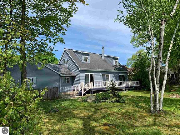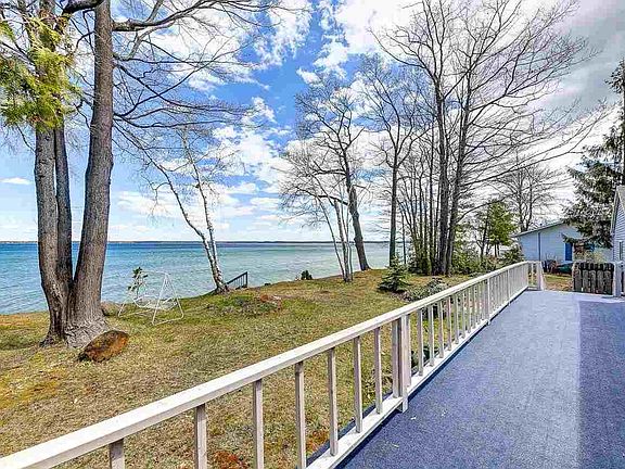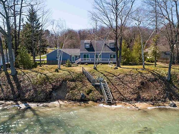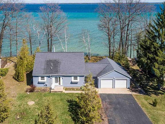 Cozy Cape Cod styled home with breezeway and full two-car garage. Nicely landscaped lot with mature trees and 100' of direct water frontage on East Grand Traverse Bay. Each day begins with sunrise water views from the kitchen, dining, living, and three bedrooms. Gentle stairway to the lake has landing with bench seat midway down for secluded view of the beach and bay. A quiet, pleasant neighborhood in an area known for its vineyards and orchards provides a great setting to enjoy waterfront living. The kitchen, dining, and living room are an open plan design with a stone fireplace and natural gas insert. Glass sliders open this area up to full views of bay. Master bedroom, bath, and laundry are on the first level. This home offers a natural gas forced air furnace and has air conditioning as well! With some newer updates, this house could make a wonderful home or second home in the heart of the Old Mission Peninsula.