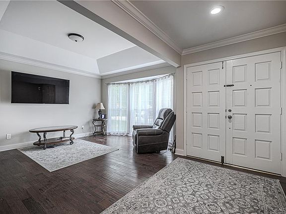 Step inside through the double front doors and you'll find a welcoming interior with crown molding, hickory hardwood flooring, and plenty of natural light. The living room features a tray ceiling and large front windows, creating a comfortable space to relax or entertain. The kitchen includes updated cabinets, granite countertops, updated backsplash, stainless steel appliances, and a stone-accented island with built-in seating.