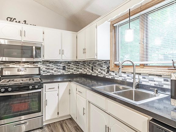 cabinets, countertops, and a stylish tile backsplash. The open dining/living room are all set beneath a